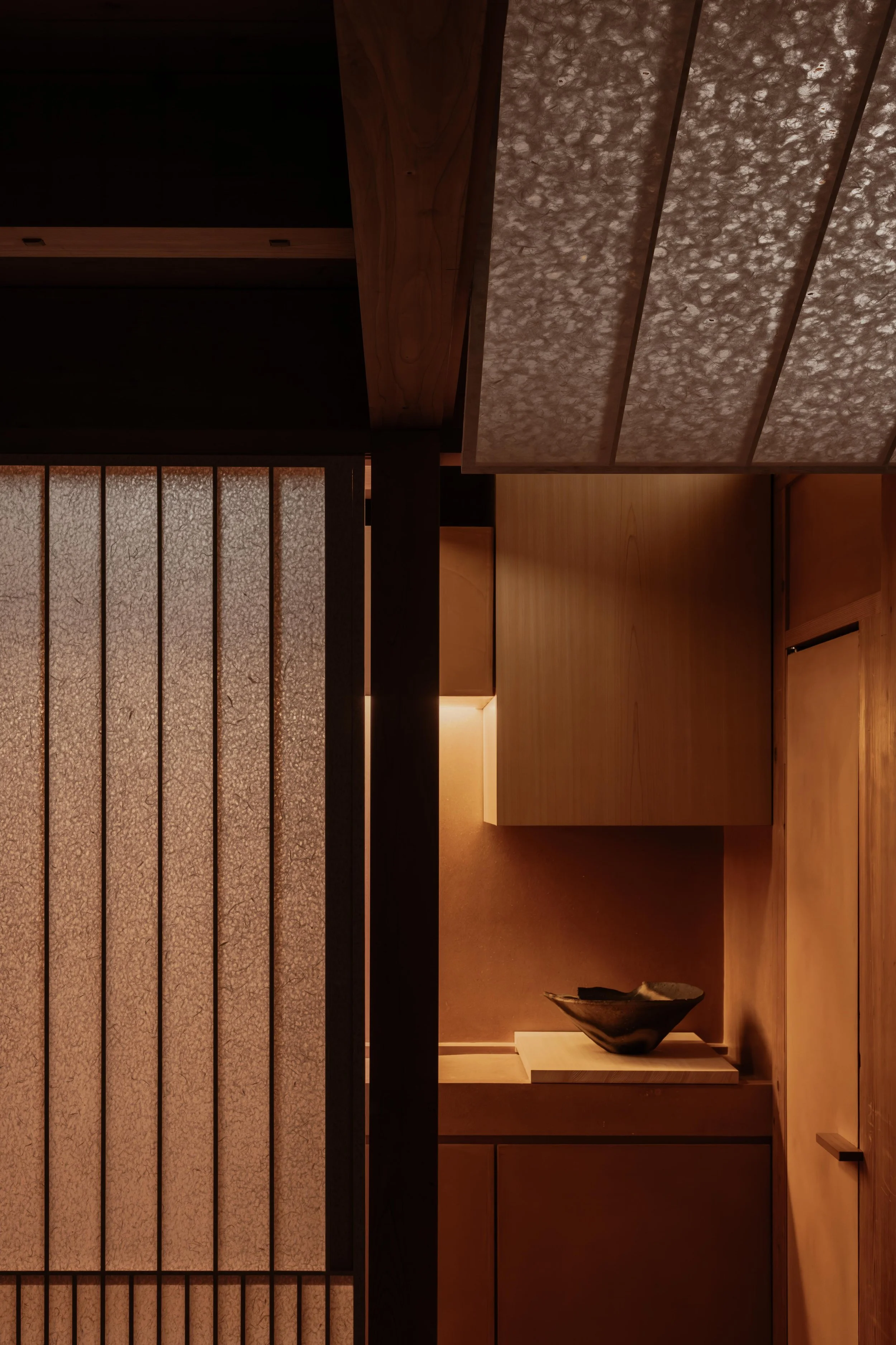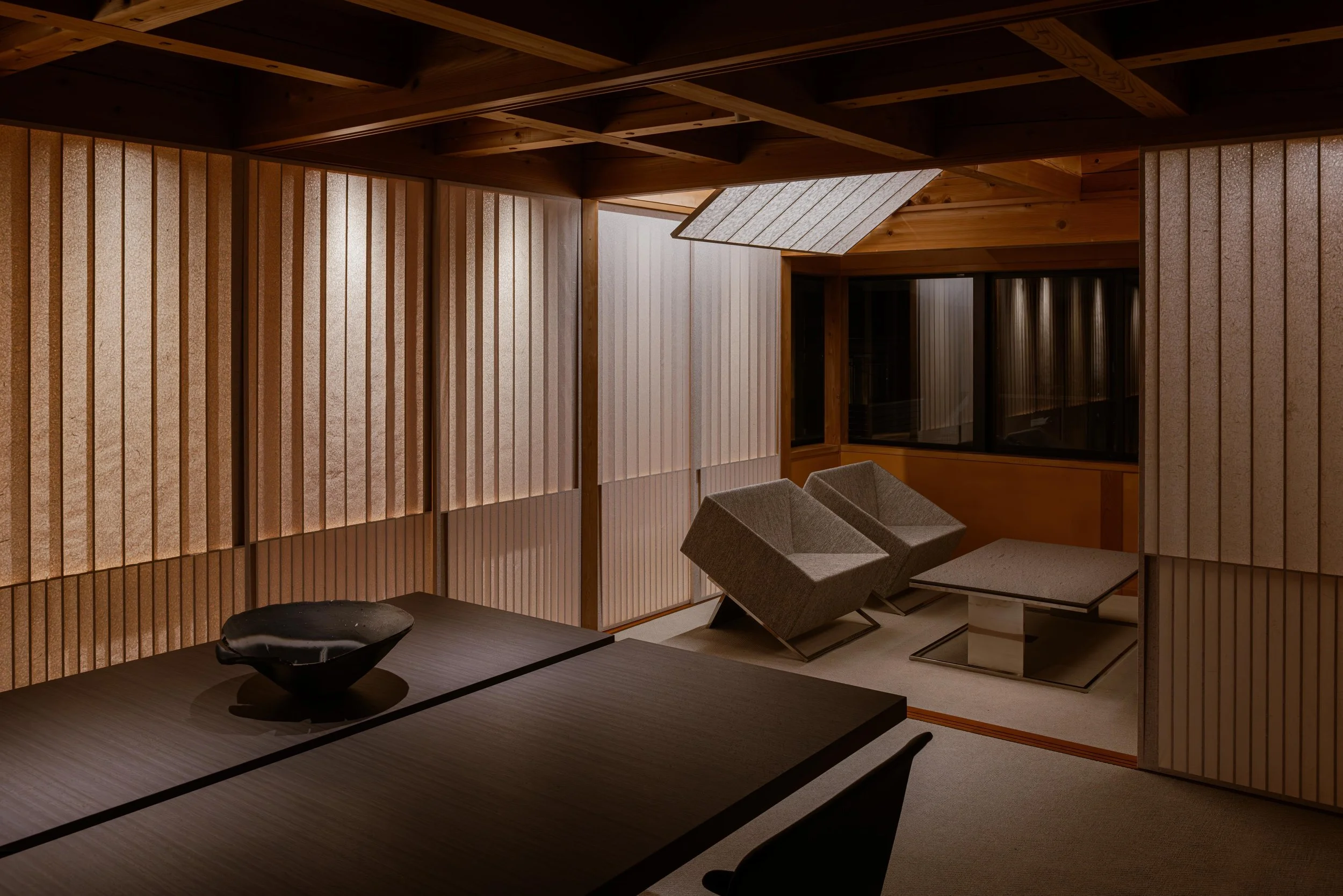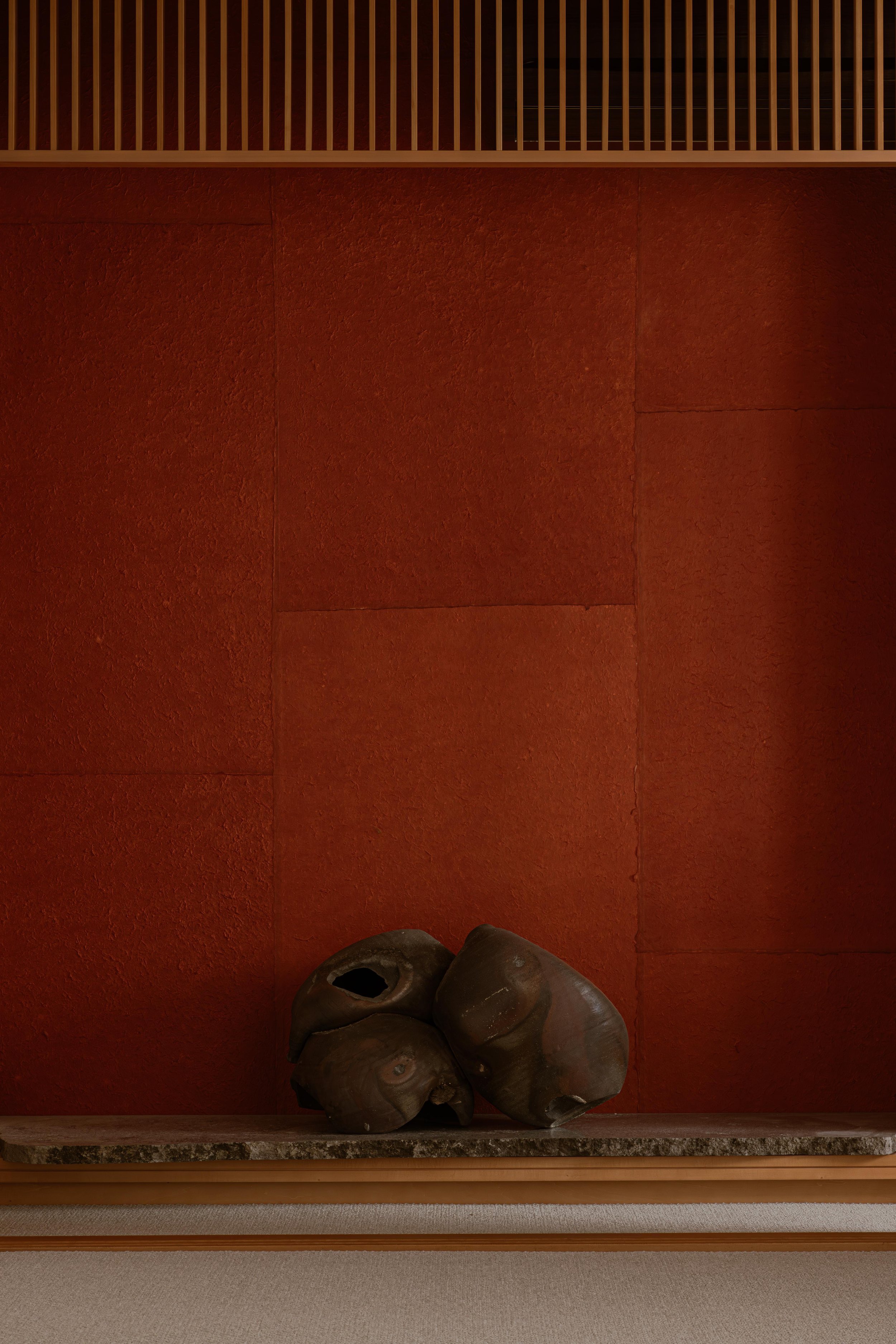 Material selection carries a sense of memory. Red earth sourced from Ishikawa was applied in layered plaster by artisans, its hue carefully tuned to sit alongside the timber structure. Shoji partitions were produced using reclaimed Tosa washi that had been destined for disposal. Too delicate for architectural use in its original form, the paper was layered to achieve strength while retaining its translucency.