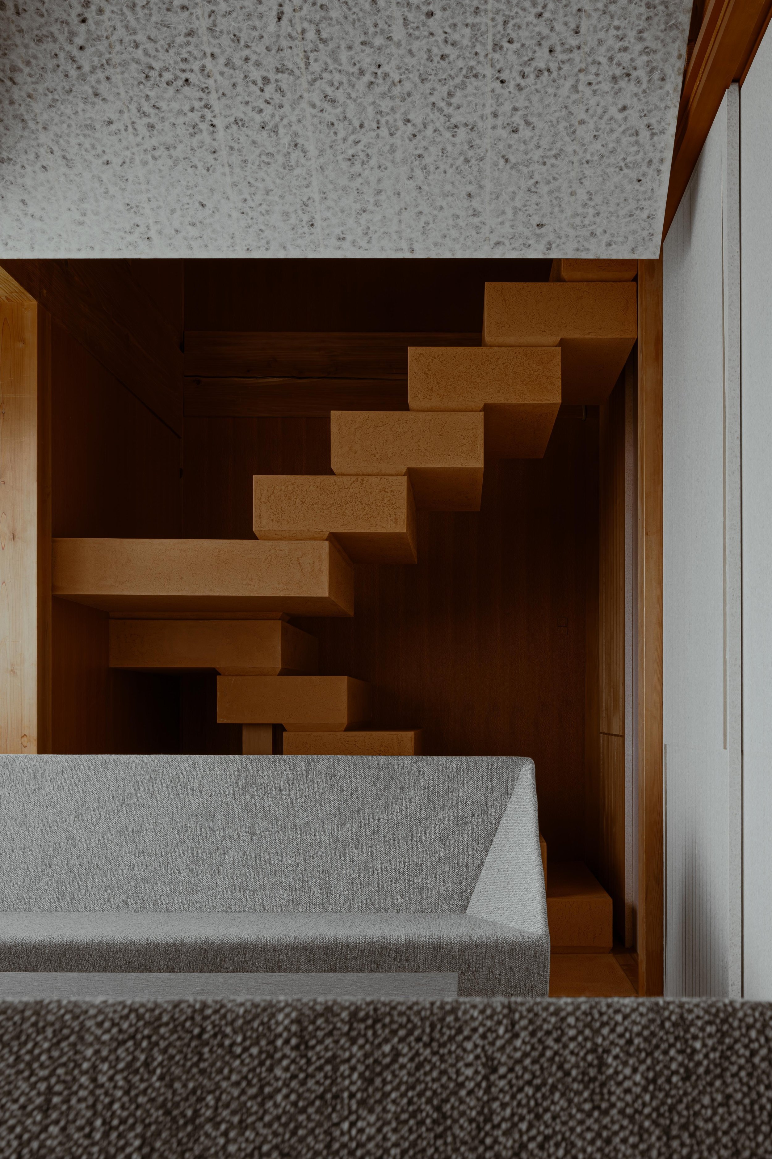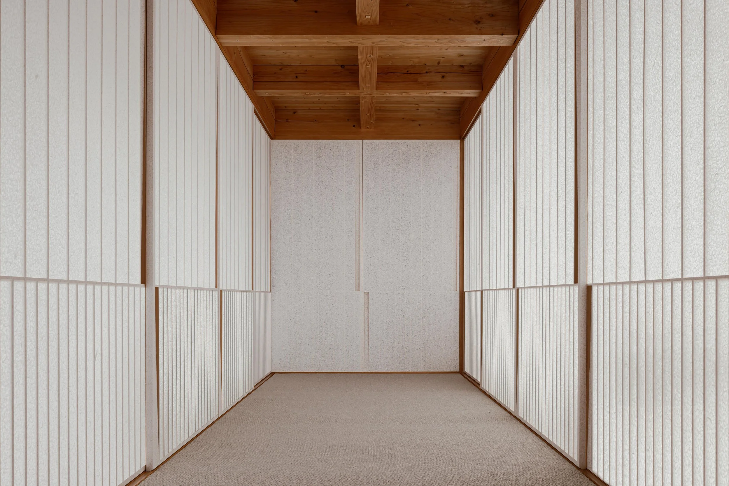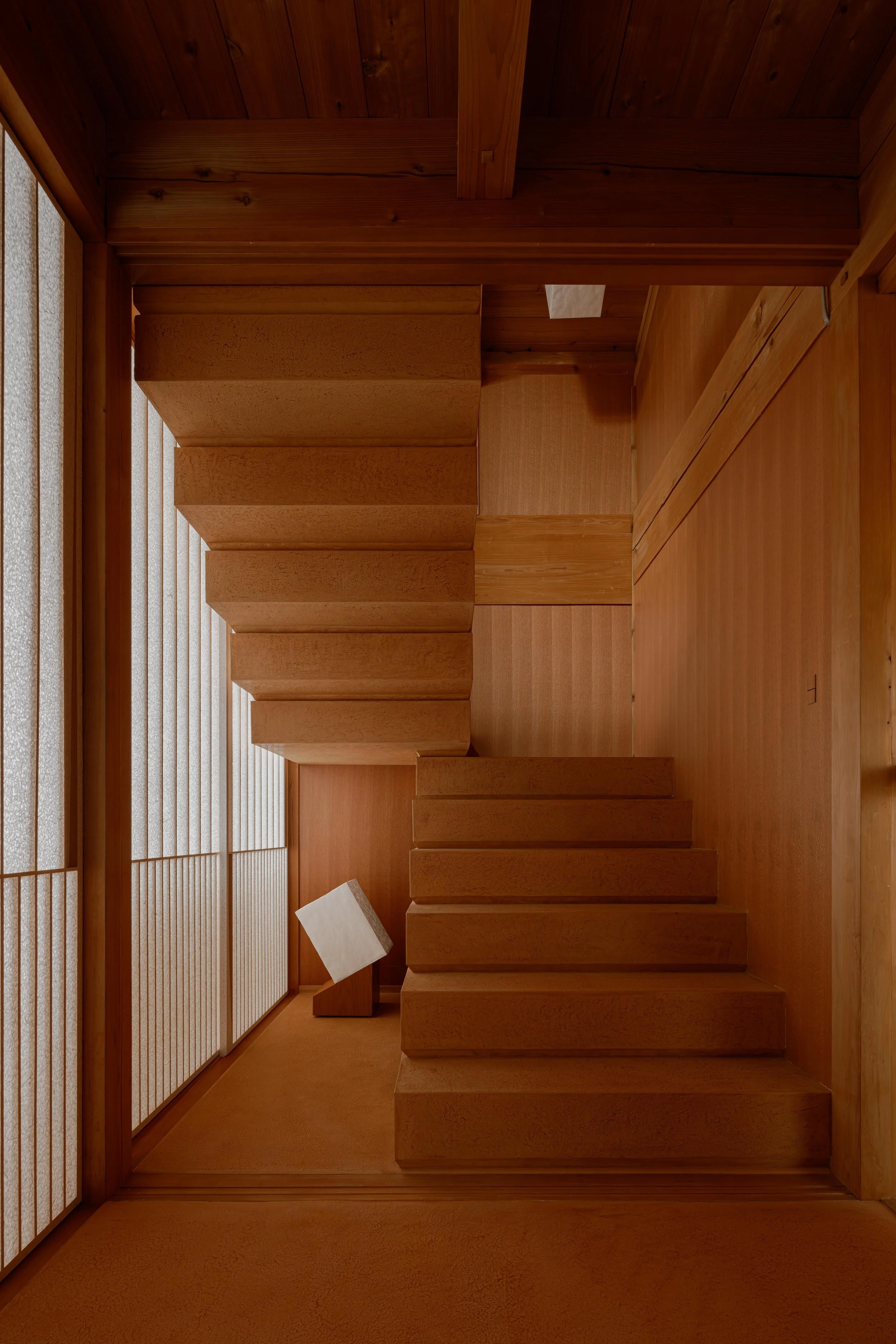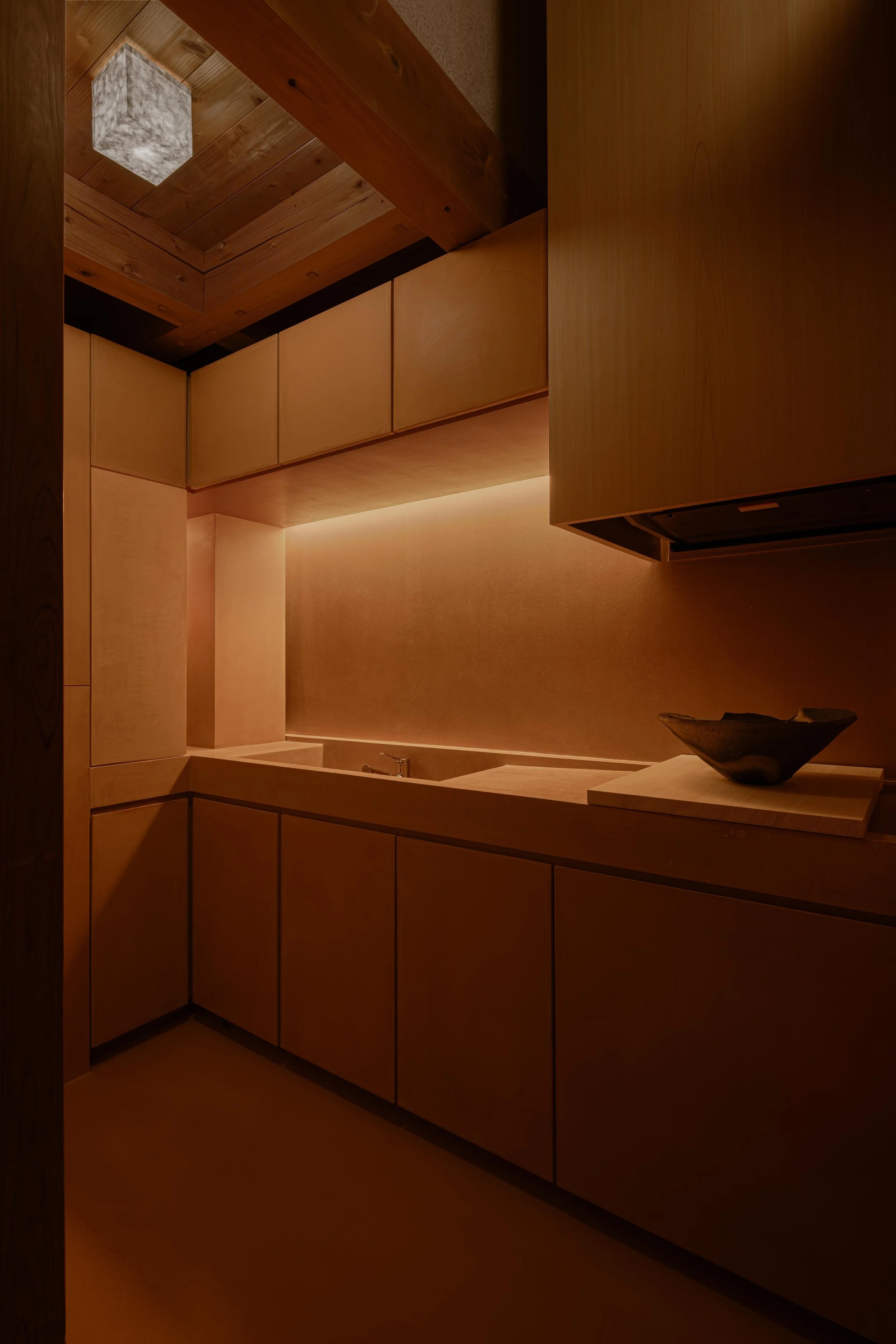 Material selection carries a sense of memory. Red earth sourced from Ishikawa was applied in layered plaster by artisans, its hue carefully tuned to sit alongside the timber structure. Shoji partitions were produced using reclaimed Tosa washi that had been destined for disposal. Too delicate for architectural use in its original form, the paper was layered to achieve strength while retaining its translucency.