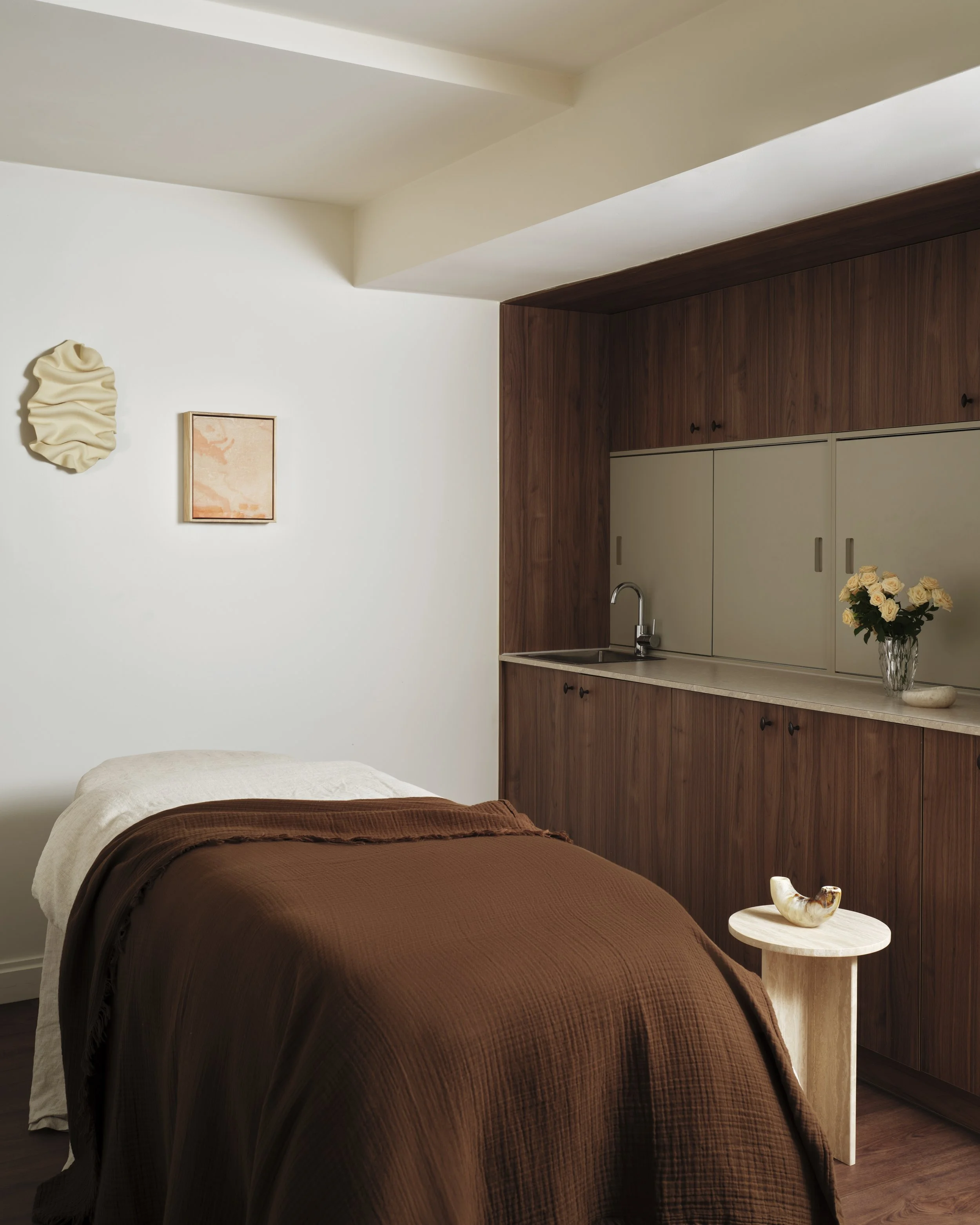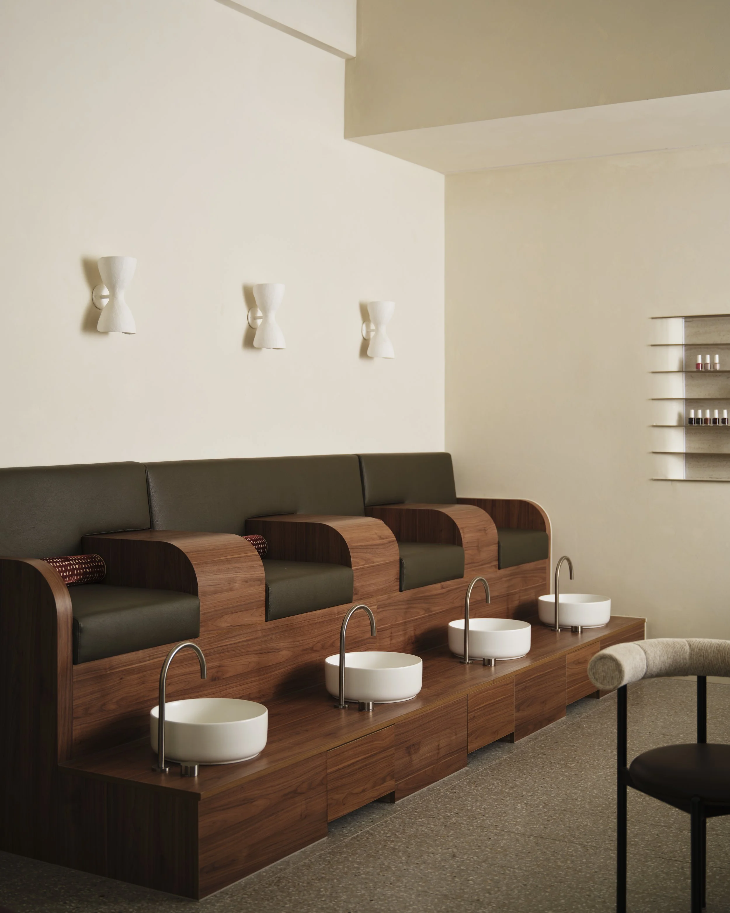 Treatment rooms adopt a more pared-back character, balancing minimalism with personality. Artworks, lighting, mirrors and upholstery are carefully curated to add layers of softness and individuality. On the ground floor, high ceilings and light finishes cultivate a sense of calm and openness, while upstairs, the mezzanine treatment rooms are wrapped in floor-to-ceiling bronze glass mosaic tiles, creating a cinematic shift in tone that infuses these spaces with glamour and depth.