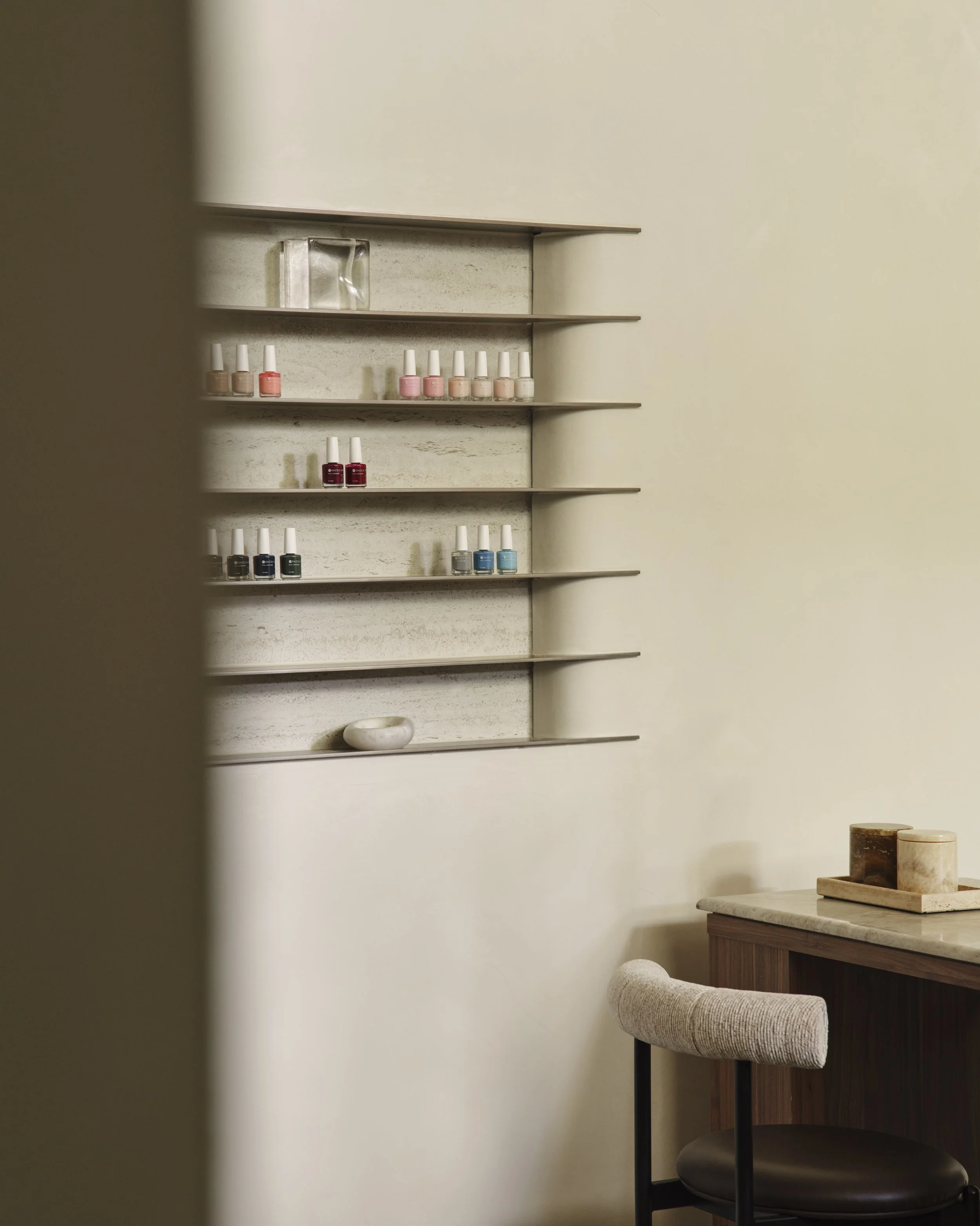 A sculptural stair wraps around a raw onyx hand basin set atop a curved tiled plinth, softly illuminated by linen pendant lighting from Rakumba. This pairing of robust forms and gentle materials threads through the entire salon. A base palette of chalky white, pale grey and creamy beige anchors the scheme, while saturated accents of green and pink, alongside timber and metal, introduce contrast and weight.