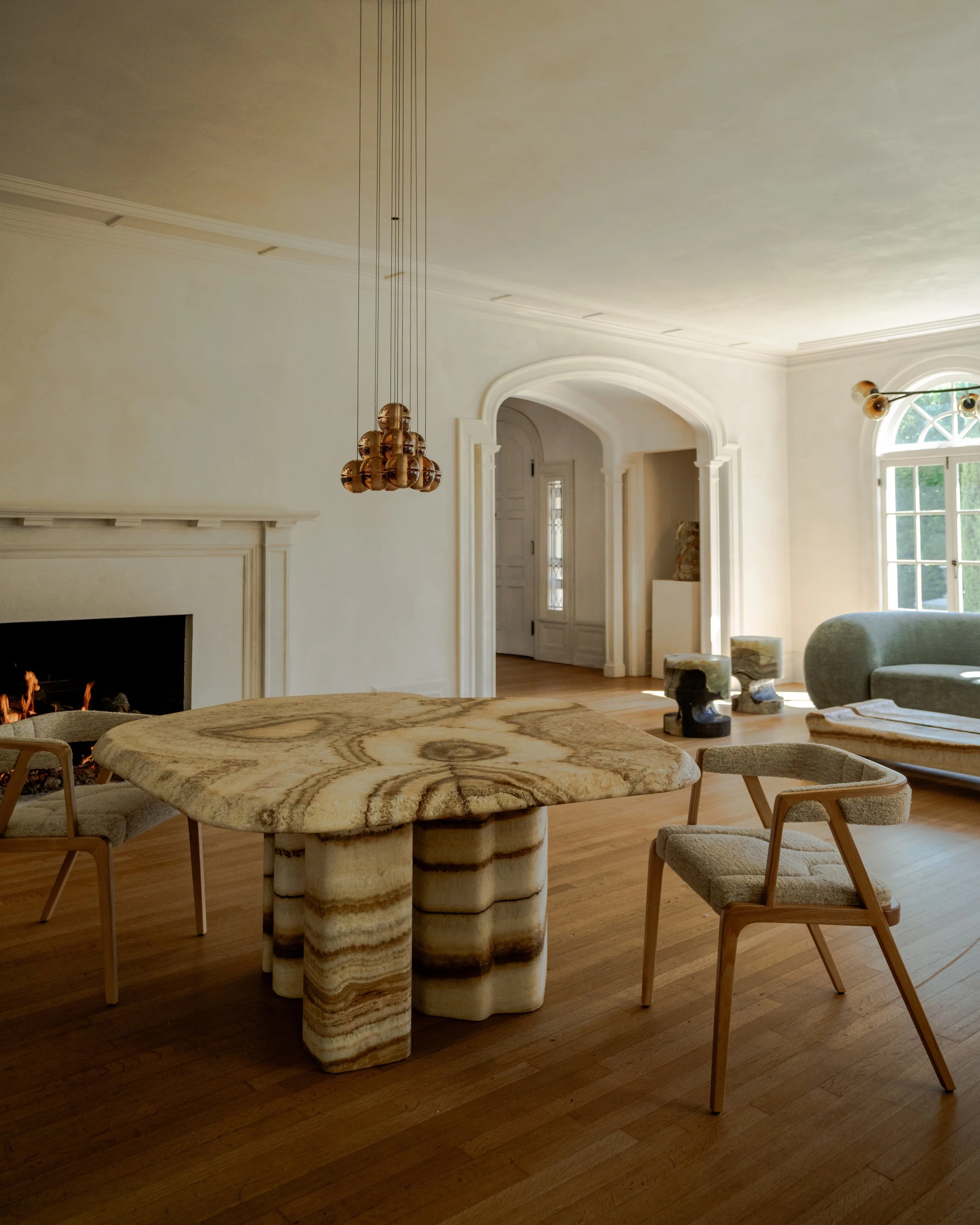 Alongside these stone pieces, Lemaire introduces furniture designed with the same attention to form and materiality. The OMNIA sofa and lounge chair feature soft, fluid lines that evoke the mineral qualities of onyx, while the KAALA and TWIST collections, crafted in burnt steel, fuse fire and form in compositions that feel both spontaneous and precise. Each piece balances a controlled approach to material with the expressive potential of the artisan's hand.