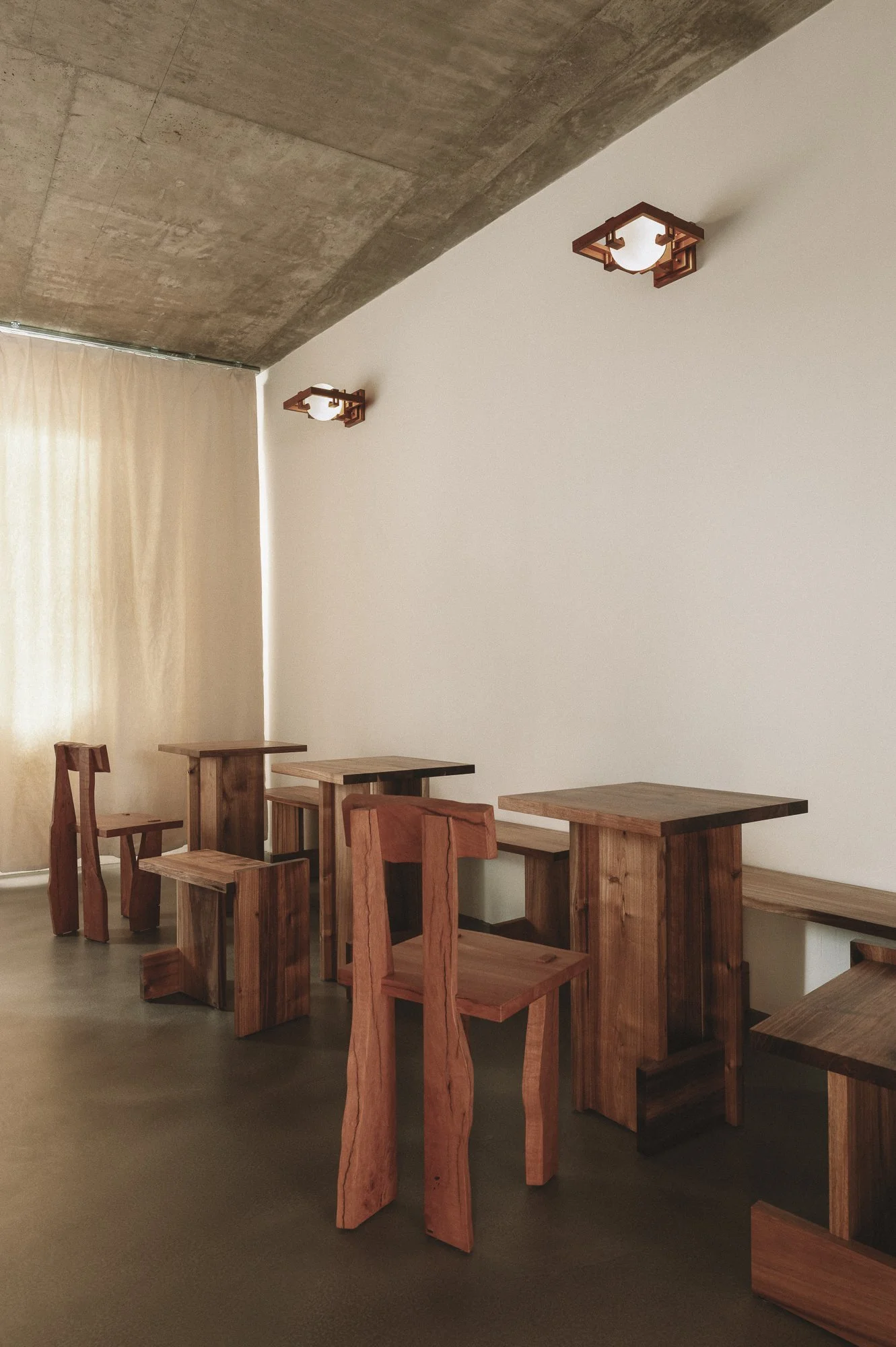 Housed within a 70-square-metre unit, the design begins with a clear organisational premise: two anchor elements shape the plan, a monolithic coffee bar and a dedicated DJ HiFi setup. From these fixed points, the room is arranged into two distinct zones. At the front, a low-slung listening area gathers around the booth and speakers in an immersive, near-lounge configuration. Toward the rear, a more intimate nook rises in height, offering a quieter vantage for conversation and the slower choreography of pour-over brewing. A wood-framed glazed shopfront, designed to open in warmer months, extends the room outward and softens the boundary between interior and street.