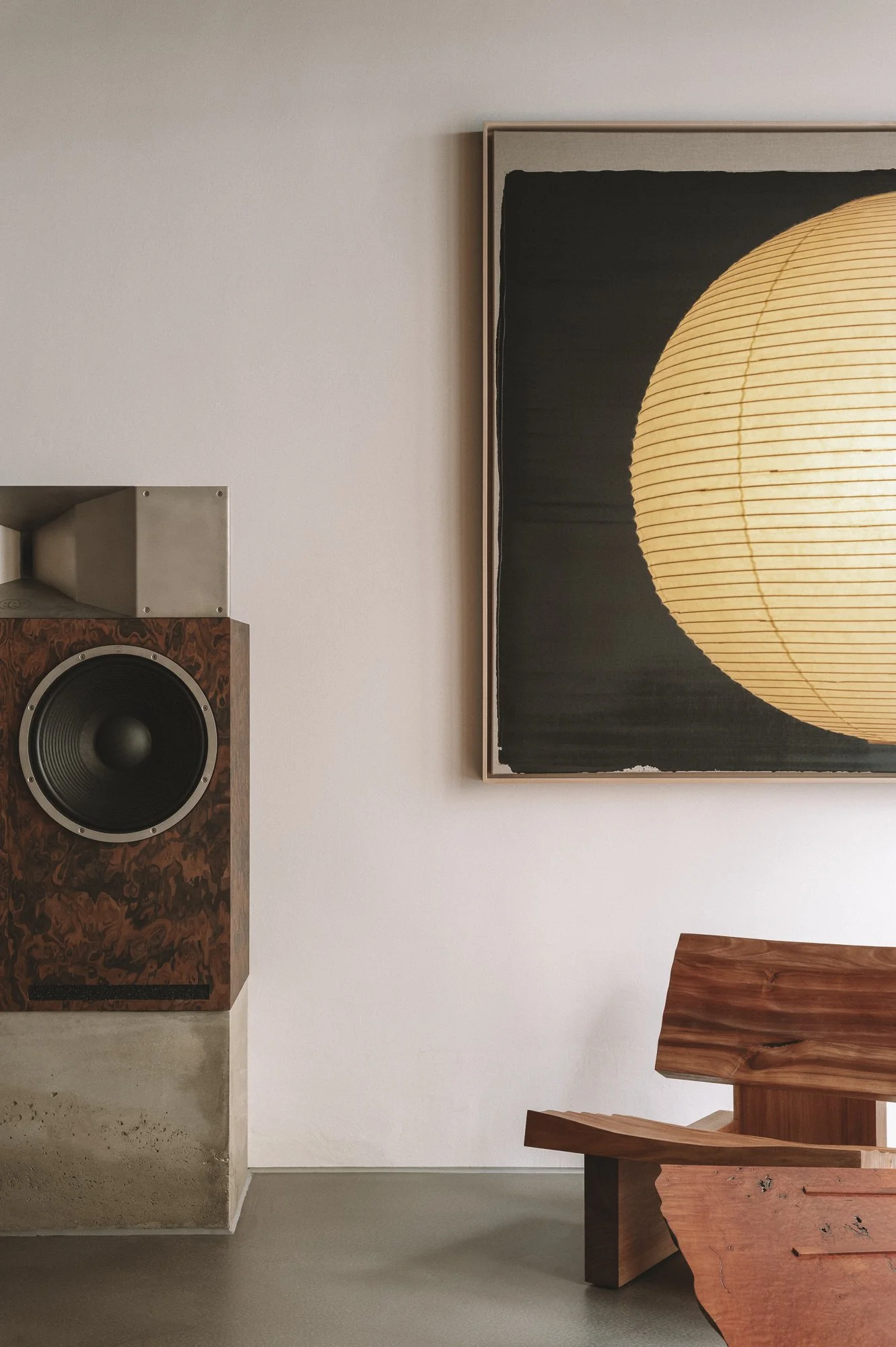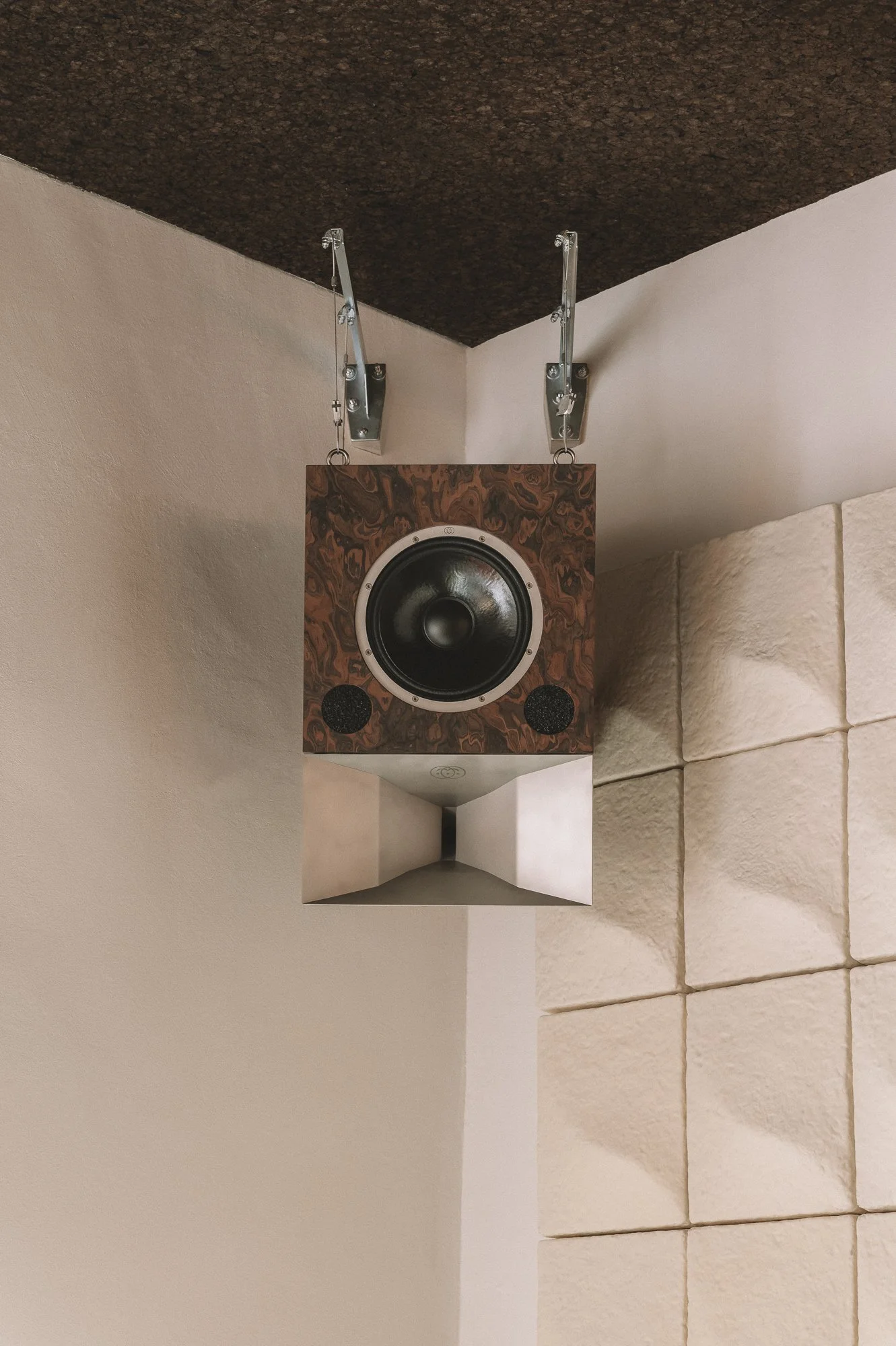 Von Thien’s background across art, architecture and coffee culture is felt in the detailing and collaborations that support the interior’s quiet confidence. The bespoke sound system was developed with Berlin-based H.A.N.D. HiFi, integrating the technical requirements of high-performance audio into a composition that reads as architectural rather than equipment-led. Additional acoustic refinement comes through minimally applied treatments, including mycelium-based tiles by Hamburg start-up MycoLutions and heavy curtains that modulate both reverberation and glare.
