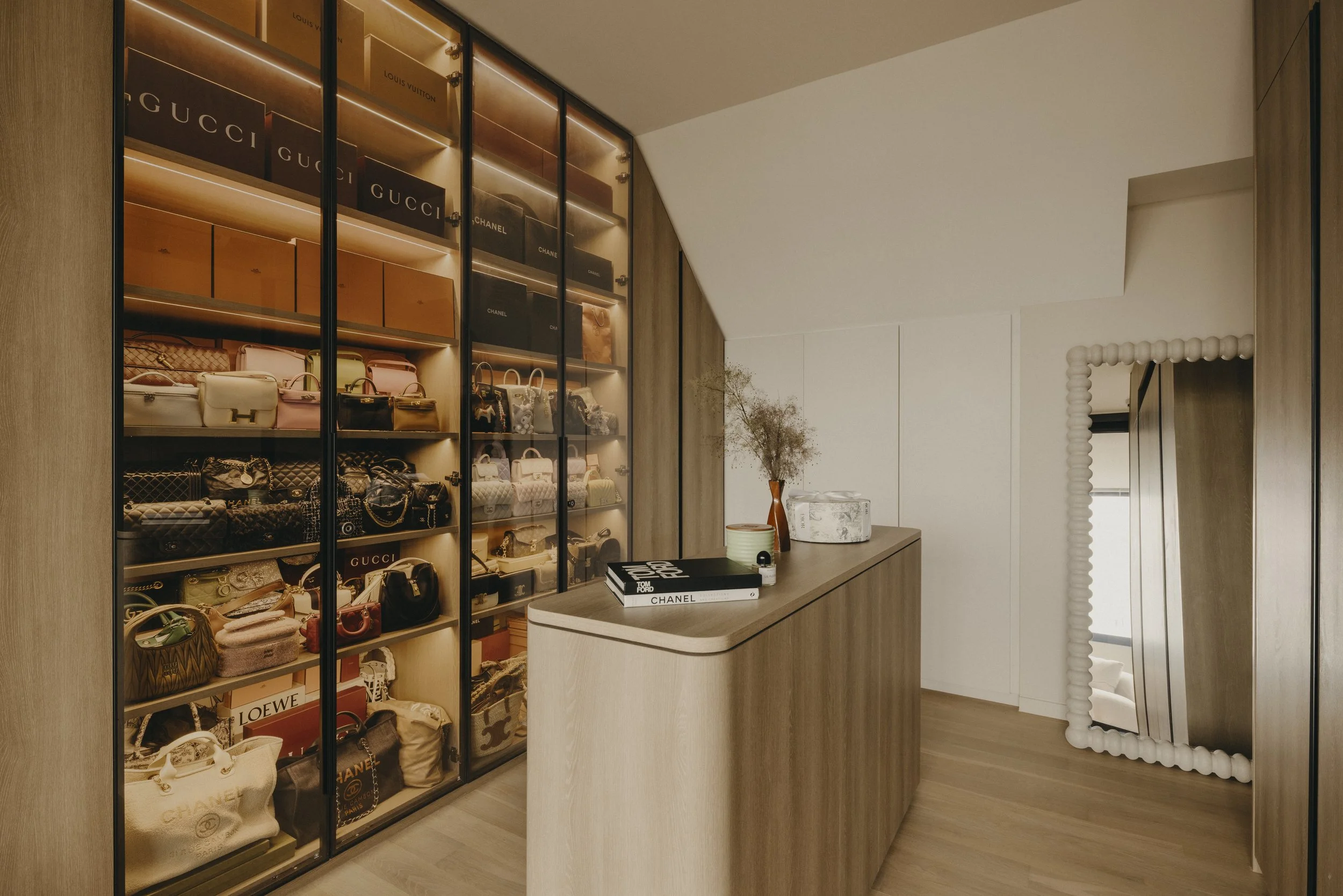 This layered approach continues into the bedrooms and walk-in wardrobe, where the tonal browns extend the sense of softness into more intimate quarters. The progression between zones is seamless, from gathering spaces designed for family life to secluded rooms that encourage quietude and solitude. Each transition has been carefully considered, ensuring the house supports both collective experience and private reflection.