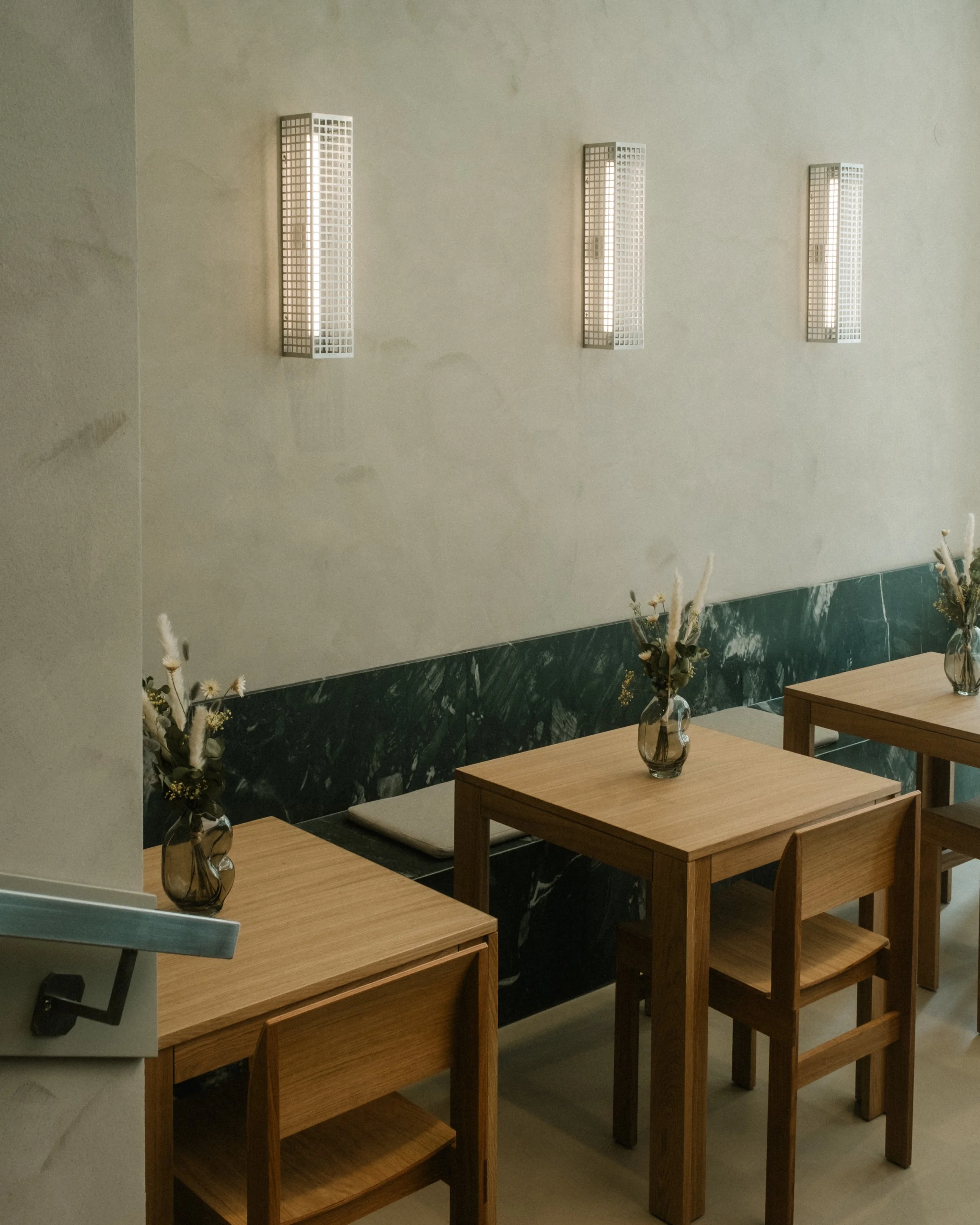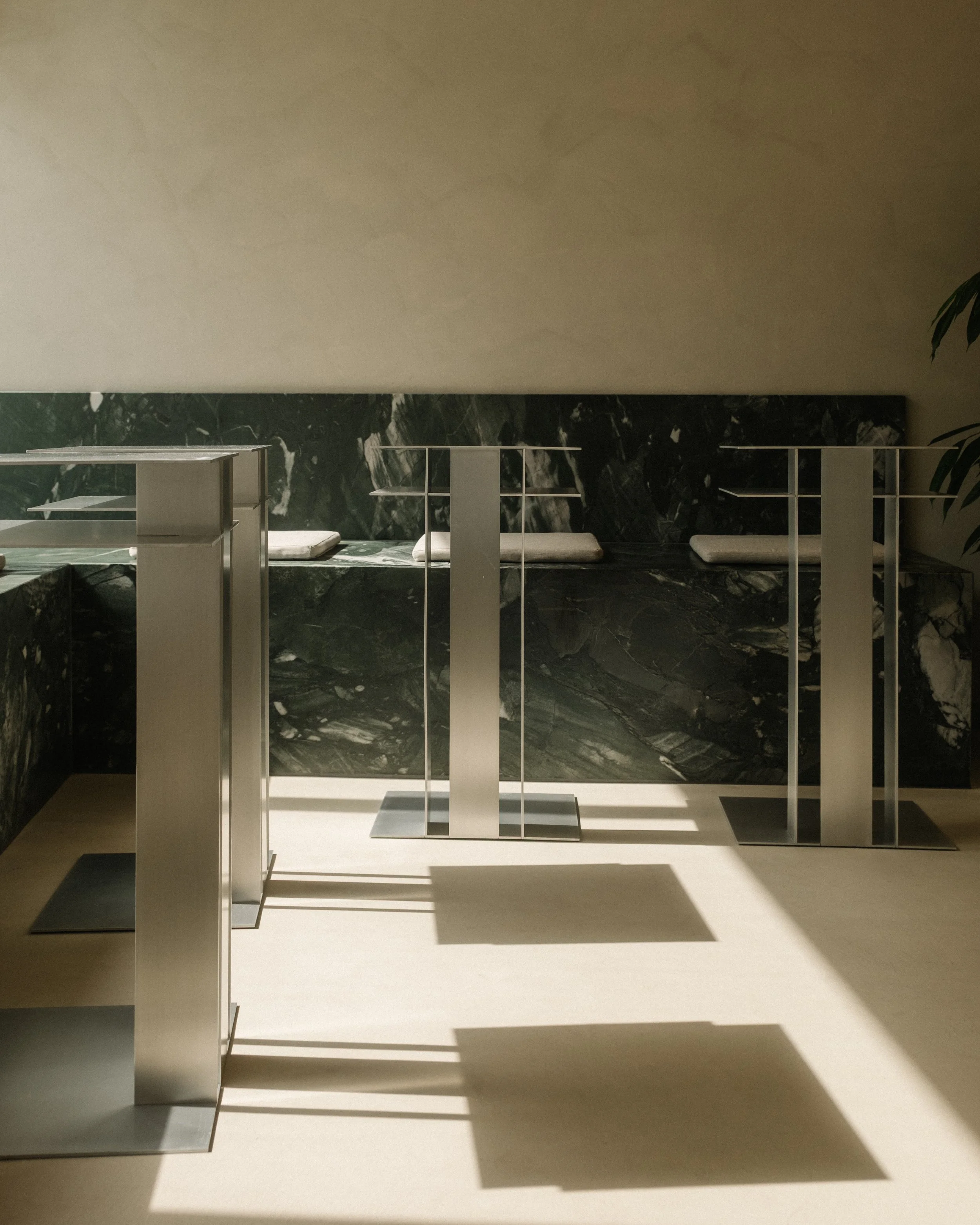 This softness is sharpened by the presence of stainless steel details, which add precision and a distinctly contemporary edge. These elements bring a technical clarity to the café, reinforcing the brand’s commitment to craftsmanship and progress. The dialogue between raw textures and refined finishes gives the project a strong identity, balancing warmth with exactness.