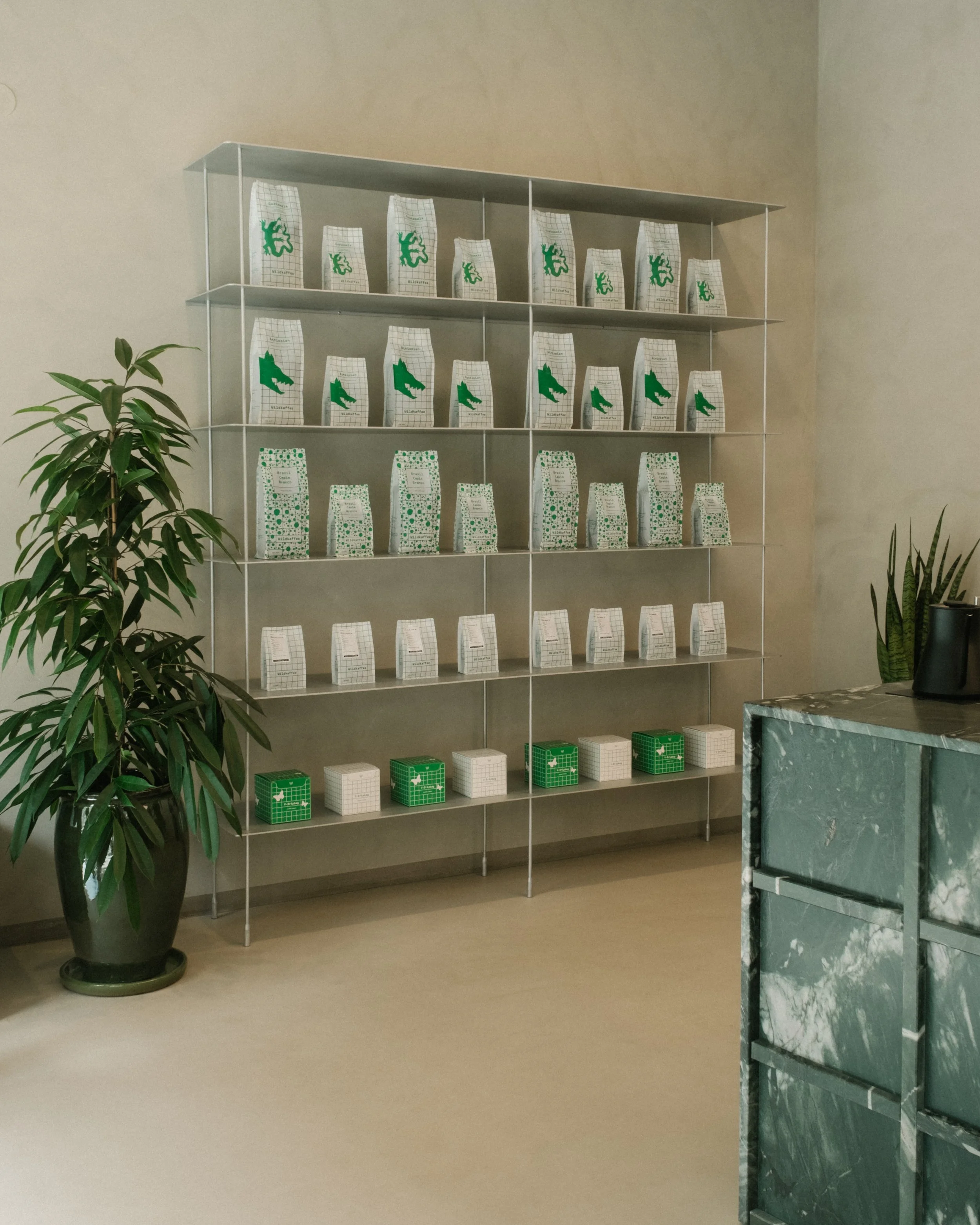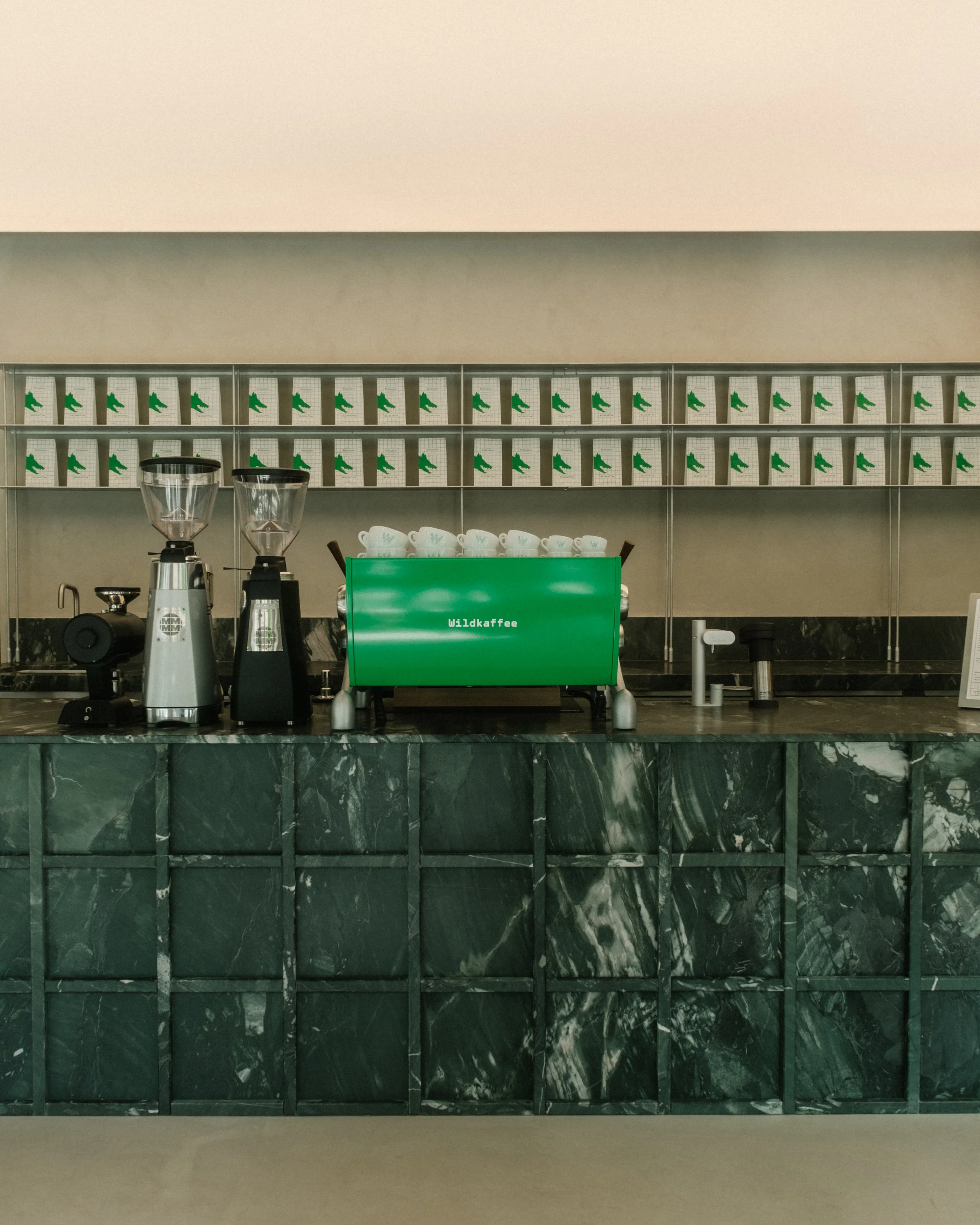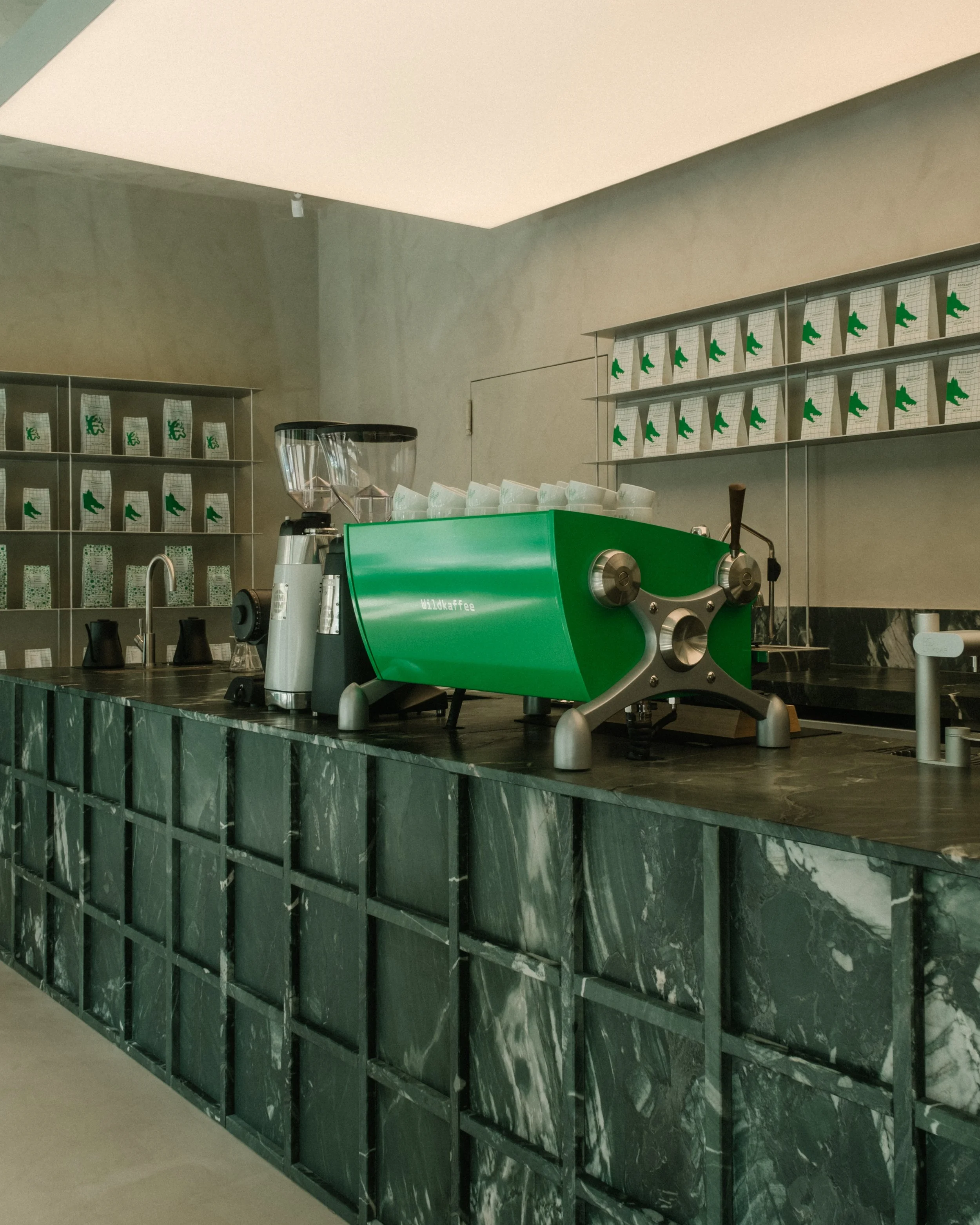 At the heart of the space, a vivid green Slayer espresso machine stands as a focal point. Its bold presence injects energy into the muted interior and signals a fresh perspective on modern coffee culture. Through this careful interplay of materiality, color, and detail, Wildkaffee Vienna becomes more than a café interior. It is a thoughtful brand environment where every design decision supports a grounded yet progressive vision.