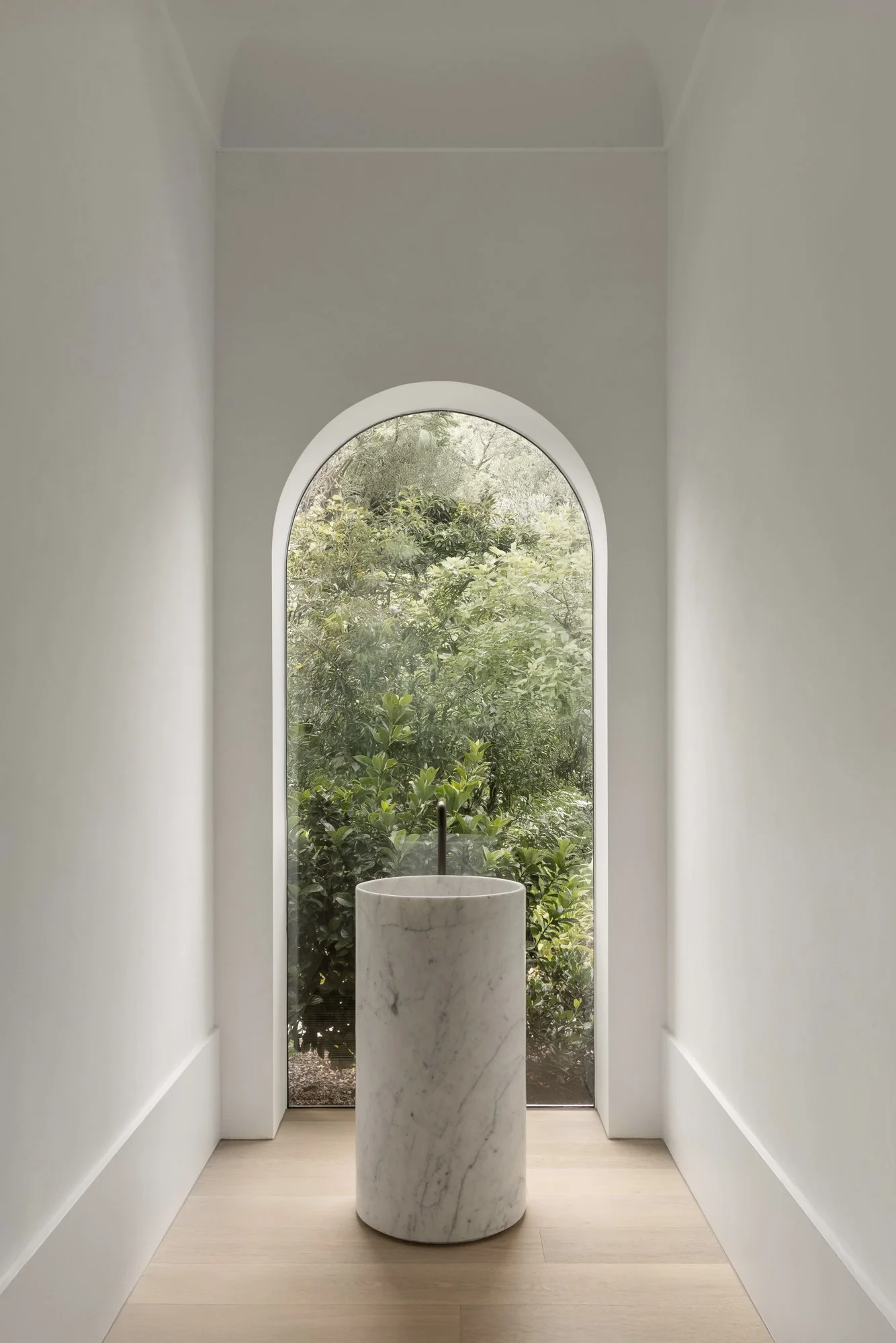 Internally, that same philosophy carries through. Every gesture is deliberate, every detail composed. The original cornices and skirtings are reinterpreted with subtlety, their profiles held away from the walls to heighten presence without overstating. In the central stairwell, a circular skylight pools light deep into the plan, softening movement through the home and offering moments of stillness in transition. Similar gestures repeat in the kitchen, where sculpted forms and curved detailing recall the home's early origins while remaining distinctly contemporary in expression.